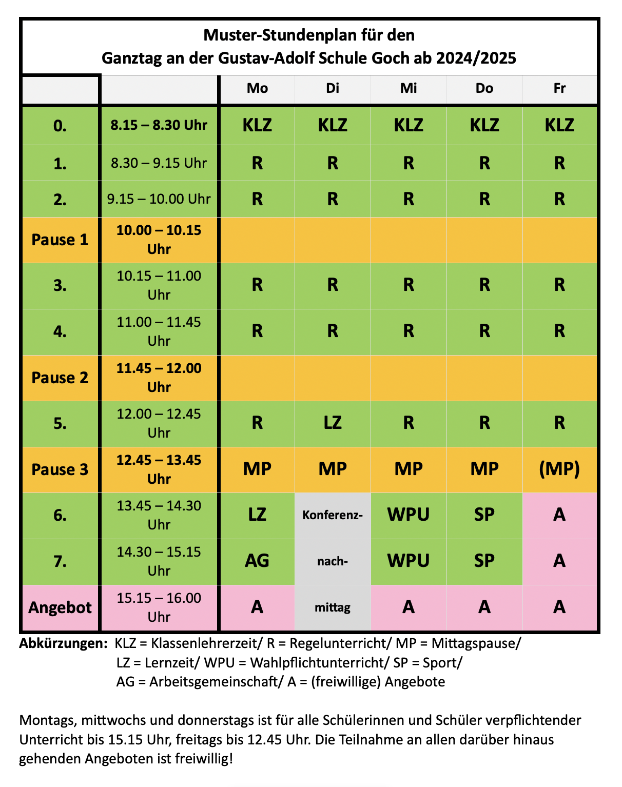 Ganztag: Musterstundenplan für den Ganztag der Gustav-Adolf-Schule Goch ab 2024/25